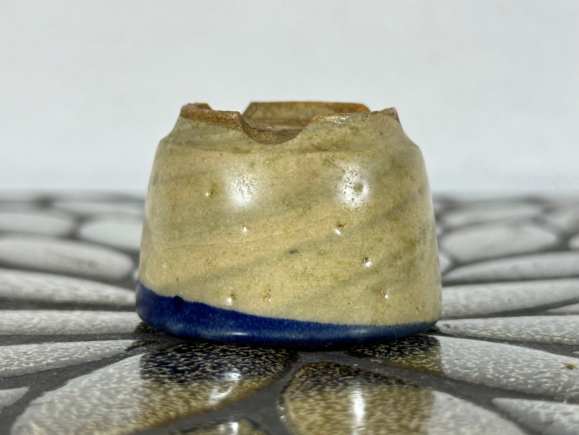 Preowned Japanese Tokoname Glazed Round Bonsai Pot with Stamps - 1.75” By 1 1/8”