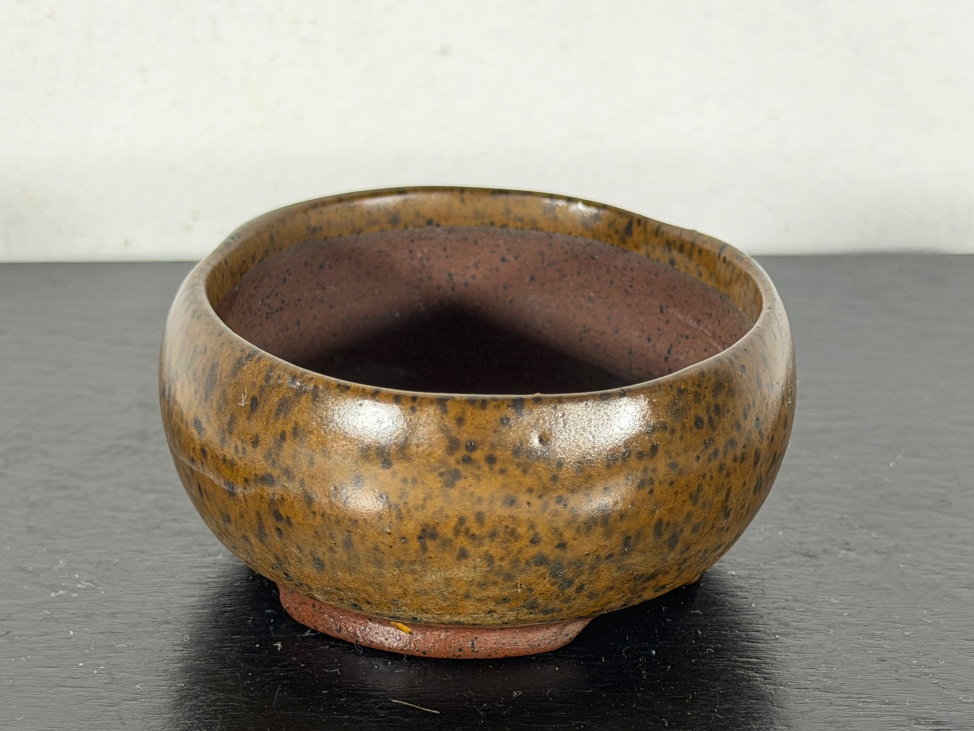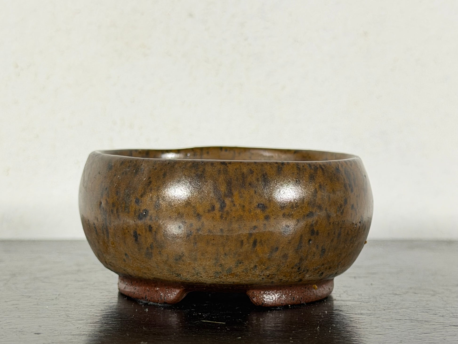 Preowned Japanese Tokoname Glazed Round Bonsai Pot With Stamp - has patina